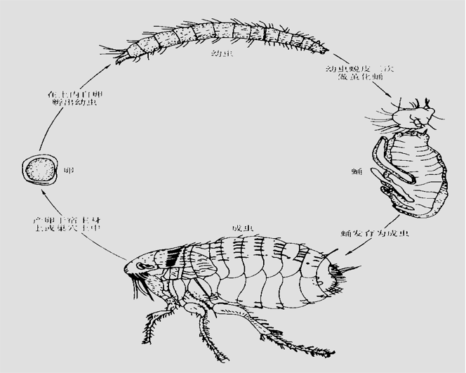 1)跳蚤生活史。跳蚤屬於完全變態昆蟲,生活史有(yǒu)卵、幼蟲、蛹、成蟲4個時期(見圖6—5)。雌蚤交配後產卵,大多產於宿主毛(máo)內或(huò)巢穴的塵土中(zhōng)。溫、濕度適宜時約5天可孵化出(chū)幼蟲,幼蟲蛆形,乳白(bái)色,無眼無足,多在陰暗(àn)地麵、縫隙中及(jí)鼠洞(dòng)、犬貓窩等處活動(dòng)。幼蟲經3個齡期,適宜條件下2~3周蛻(tuì)皮兩次發(fā)育為成熟(shú)幼(yòu)蟲(chóng),其自行吐絲做繭(jiǎn),在繭內化蛹。蛹期通常1~2周,有的(de)長達1年或更長。成蟲羽化(huà)出繭需要刺激,如動物來臨所帶來的空氣振動,接觸(chù)壓力,或溫度升高,均(jun1)可誘導成蟲破繭而出,否則可靜伏於繭內。通常(cháng)由卵發(fā)育為成蟲約需1 個月。雌蚤一生可產(chǎn)卵數百(bǎi)至上千個,壽命為l~2年。